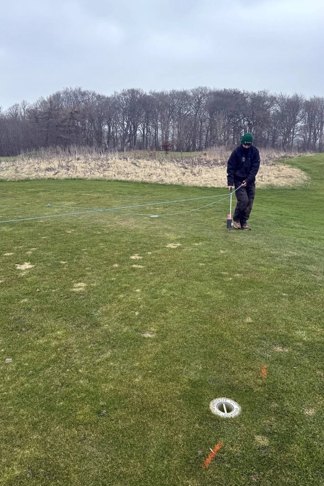 Derudover er vi i gang med teestederne, hvor vi har optegnet dem med orange spray for at få en mere ensartet og rund form. De vil efterfølgende blive vertikalskåret, eftersået og topdresset med sand. Det gør vi for at få rettet dem op og skabe stærkere teesteder, som over tid bliver bedre rustet til det slid, de udsættes for.