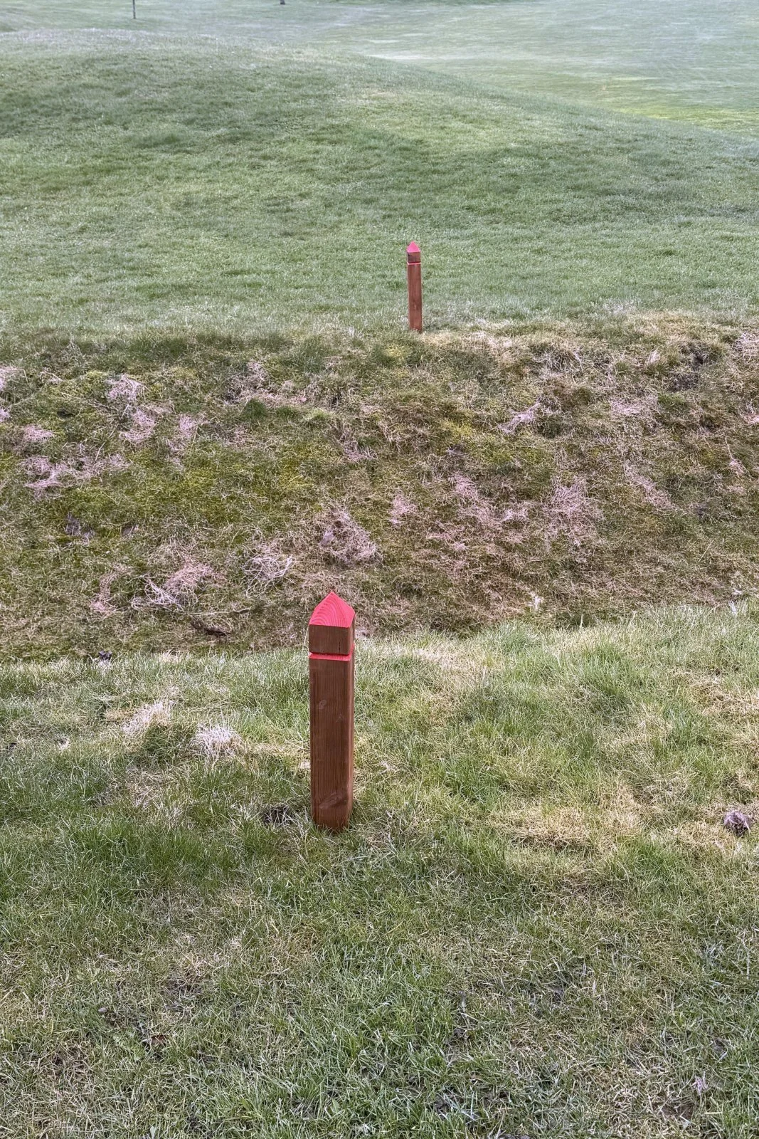 Vi har opsat nye pæle ved søen og grøften på hul 2 for at gøre markeringerne tydeligere. I løbet af april vil vi løbende udskifte og opsætte tilsvarende pæle på resten af banen, så vi får en ensartet og tydelig markering overalt.